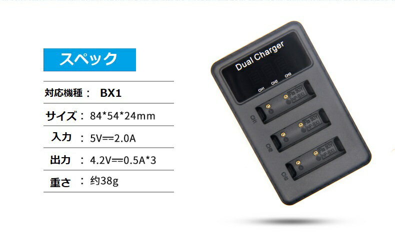 USBバッテリーチャージャー 対応機種 NP-BX1 Cyber-shot DSC-HX50V,DSC-HX95,DSC-HX99,DSC-HX300,DSC-HX400,DSC-RX1,DSC-RX1R,DSC-RX100,DSC-RX100 II, DSC-RX100M II,DSC-RX100M6,RX100 VI,RX100 V, DSC-WX300,HDR-AS10,HDR-AS15,HDR-AS30V,HDR-AS50R,HDR-GWP88,HDR-AS100V,HDR-AS100VR,HDR-AS300R,HDR-CX240,HDR-MV1,HDR-PJ275,FDR-X1000V,FDR-X3000,FDR-X3000R【3個同時充電可能】