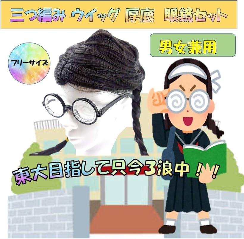 ST TS マジメ 女学生 おさげ かつら ビン底 めがね 3浪中 女子高生 三つ編み ウイッグ 髪 コスプレ 男女兼用