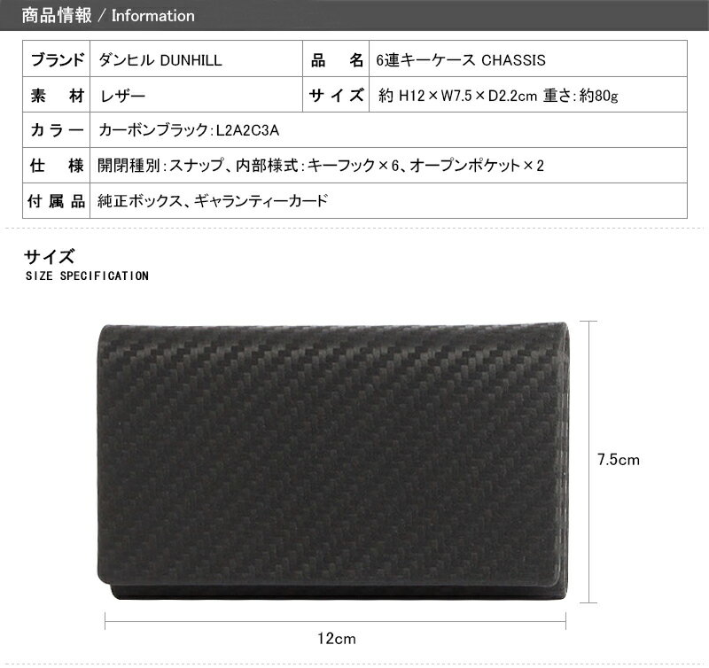 【ブランド】 ダンヒル DUNHILL 【種 類】 6連キーケース CHASSIS 【カ ラ ー】 カーボンブラック:L2A2C3A 【素 材】 レザー 【仕 様】 開閉種別:スナップ 内部様式:キーフック×6、オープンポケット×2 【サ イ ズ】 約 H12×W7.5×D2.2cm 重さ:約80g 【付 属 品】 純正BOX、ギャランティーカード 【商品説明】 Dunhill(ダンヒル) は、1880年に馬具専門製造卸売業としてロンドンで創られたイギリスを代表する高級ファッションブランドです。