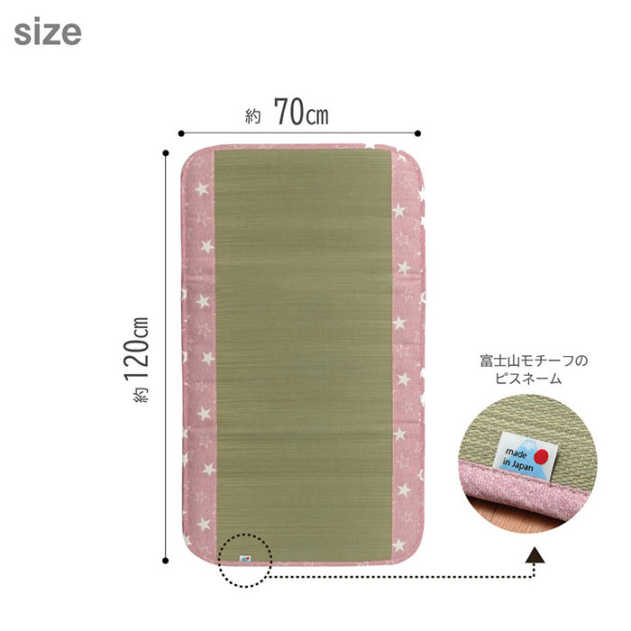 商品名日本製 い草 い草マット 子供用 お昼寝 星柄 約70×120cm 取扱タイプブルー、ピンク 商品仕様表:い草裏:い草中材:ポリエステル固綿15mm 商品サイズ(約)幅70cm×奥行き120cm 商品重量(約)1kg 梱包サイズ(約)幅73cm×奥行き43cm×高さ4cm 梱包重量(約)1kg 梱包数1個口 生産国日本 組み立て完成品 注意事項洗えません。
