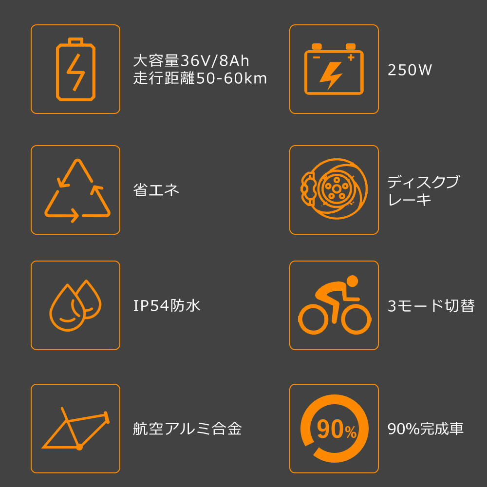 商品名 電動アシスト自転車 製品仕様 ■本体サイズ 120*116*40cm(高さ調整可能) ■折り畳み後サイズ 75*70*40cm ■フレーム材質 航空アルミ合金 ■本体重量 17kg ■耐荷重 150kg ■タイヤサイズ 14インチ ■モニター定格出力 250W ■バッテリー容量 36V/8Ah ■充電器 AC100-240V ■充電時間(目安) 4~6時間 ■プレーキ(前後車輪) 前後油圧式デスクブレーキ ■空気入れ 米式バルブ ■スタンド 足片スタンド ■アシストモード走行距離 40-50km ■防水レベル IP54 ■アシストレベル 3段階 ■ディスプレイ 液晶ディスプレイ ■照明装置 LEDヘッドライト ■3モード 電動走行・電動アシスト走行・ペダル走行 ■付属品 前カゴ、レンチ、空気入れ、スマホホルダー、充電器、日本語説明書 ■保証期間 車体フレーム(1年) モーター、バッテリー(180日) ■時速 電動自転車は道交法で時速24kmとなっています 特徴 ★