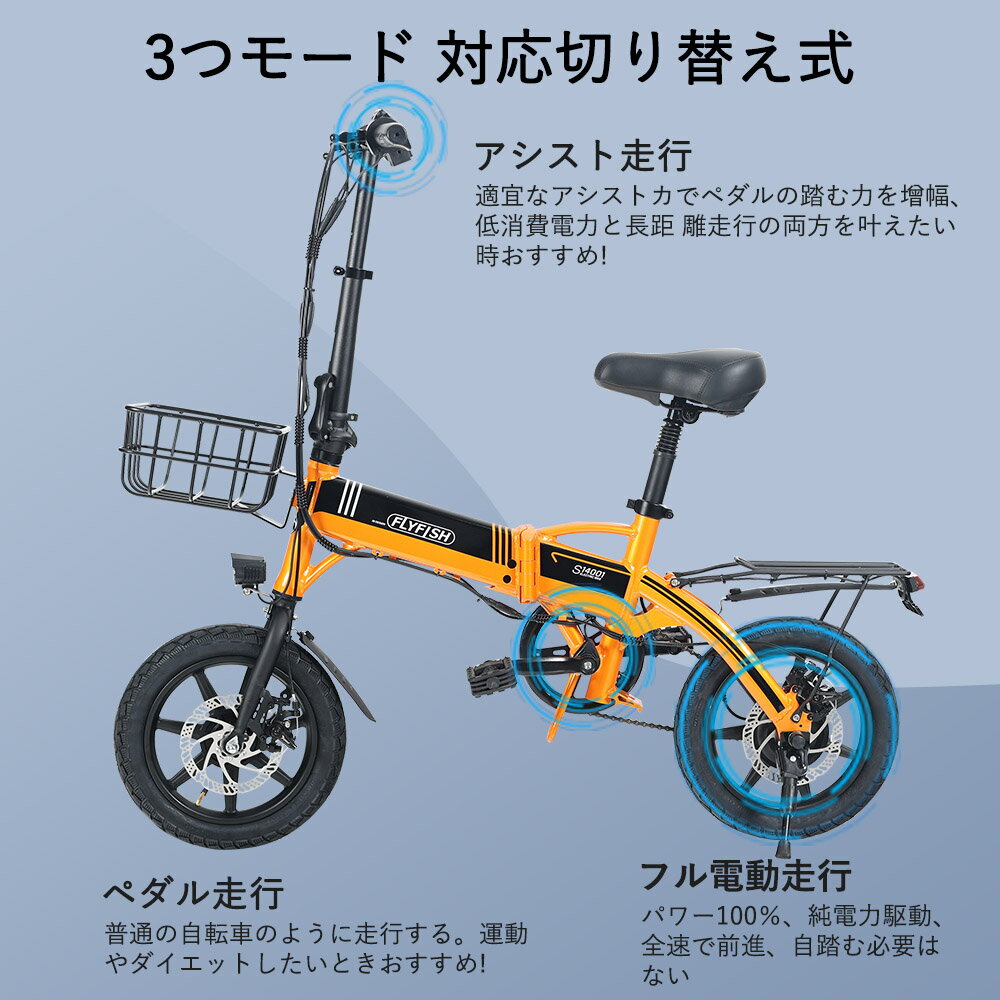 折り畳み自転車 !!! (公道可能 14インチ/20インチ) 軽量 折り畳み自転車 電動アシスト自転車 はこちら!!!製品仕様 ●商品名 FLYFISH ●商品状態 正規品、新品(未使用) ●定格出カ 250W ●アシストモ一ド 5段階切替 ●バッテリー容量 36V8Ah ●最高時速 29km/h ●航続距離 計算と検出により、フル電動で30-35KM走行可能です。