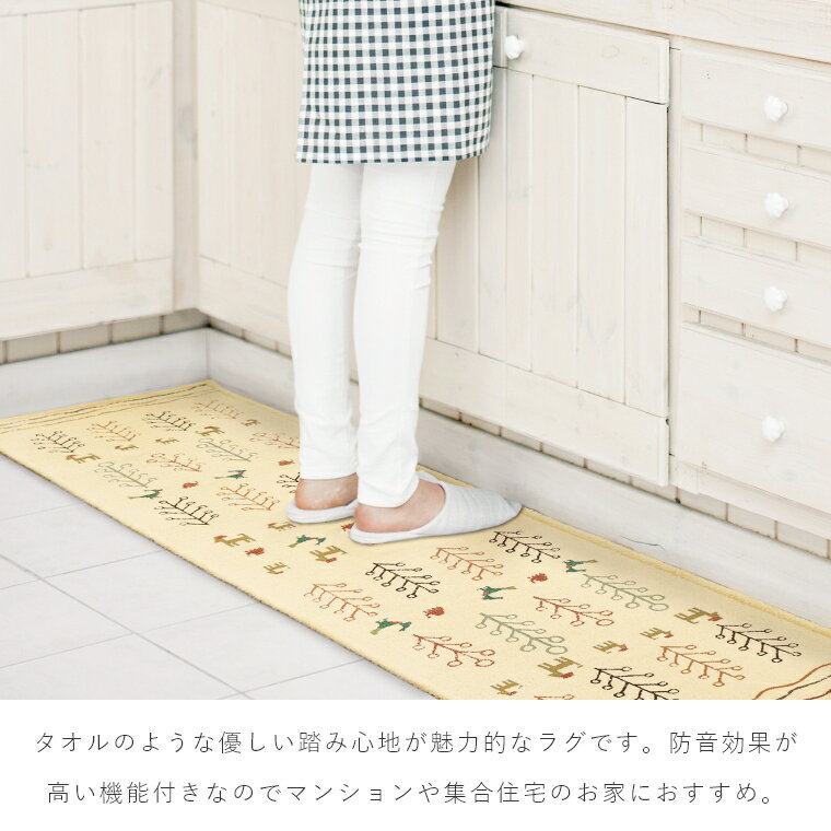 キッチンマット 洗える おしゃれ タオルのような優しい踏み心地のゴブラン織マット コルン 45×240cm プレーベル ラグマット リビング 寝室 ダイニング 北欧 お掃除ロボット ルンバ 防音 滑りにくい エスニック 民族 キリム ベージュ アジアン 不織布 台所