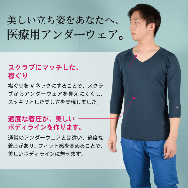 [ゆうパケット便送料無料] ミズノ MIZUNO スクラブ インナー スクラブインナーシャツ メンズ アンダーウェア インナーウェア 七分袖 ストレッチ 吸汗 速乾 医療 看護師 介護士 春夏 秋冬 ホワイト 白 ネイビー ブラック 黒 S M L 大きいサイズ チトセ ct-mz0135