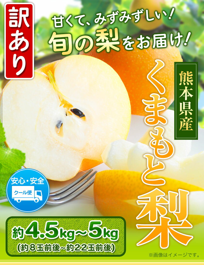 商品情報 熊本県産 訳ありくまもと梨 約4.5kg~5kg(8玉~22玉前後) 名称 梨 産地 熊本県長洲町産 内容量 約4.5kg~5kg(8玉~22玉前後) ※旬の梨をお届けいたします。