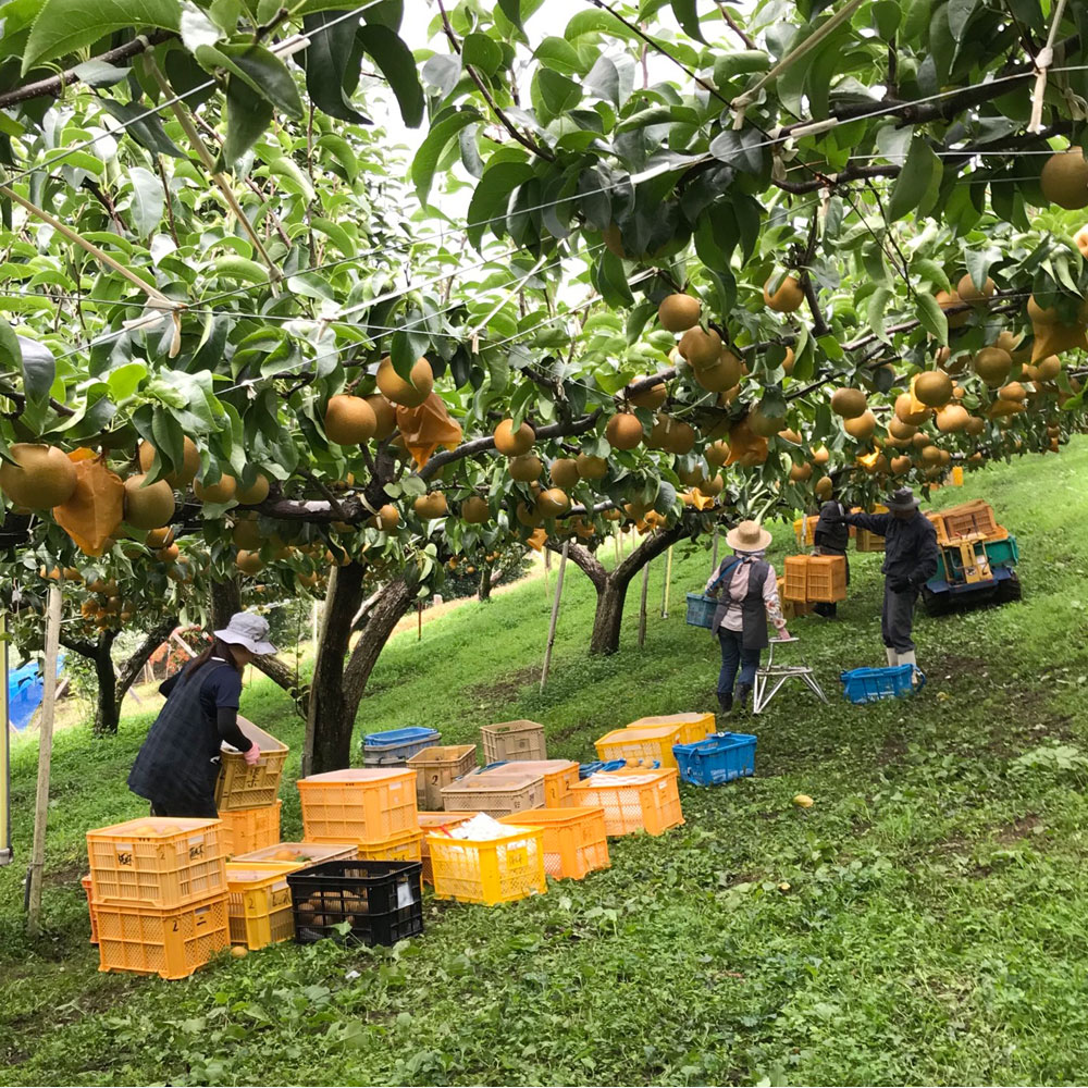 梨畑は標高600mほどの高地で寒暖差があり、澄んだ空気、豊かな水、肥沃な大地で、瑞々しく甘い立派な梨が育ちます。