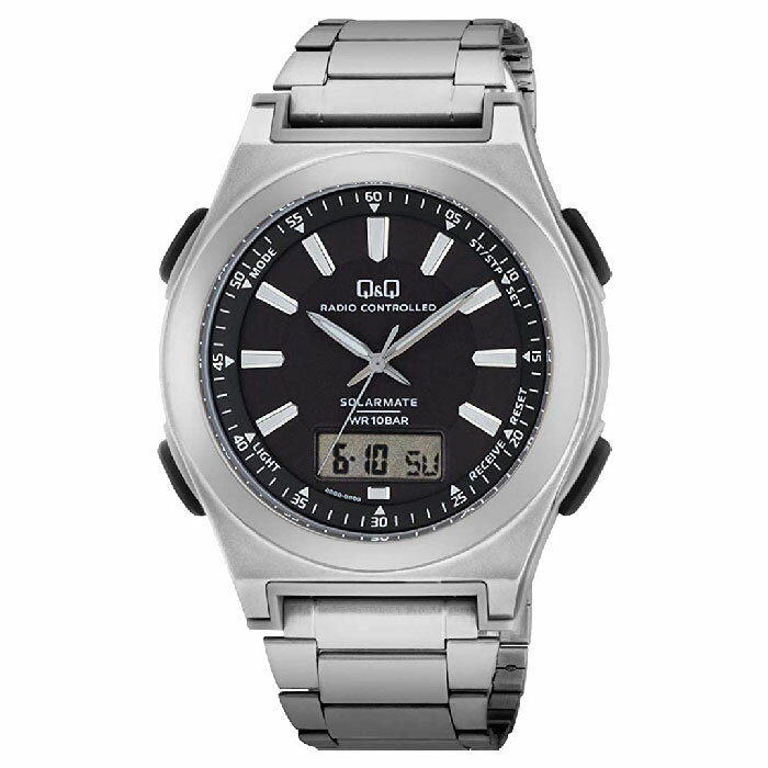 シチズン Q&Q 腕時計 アナログ 電波 ソーラー 防水 日付 表示 メタルバンド 黒 文字盤 MD10-222 メンズ シルバー【あす楽対応】