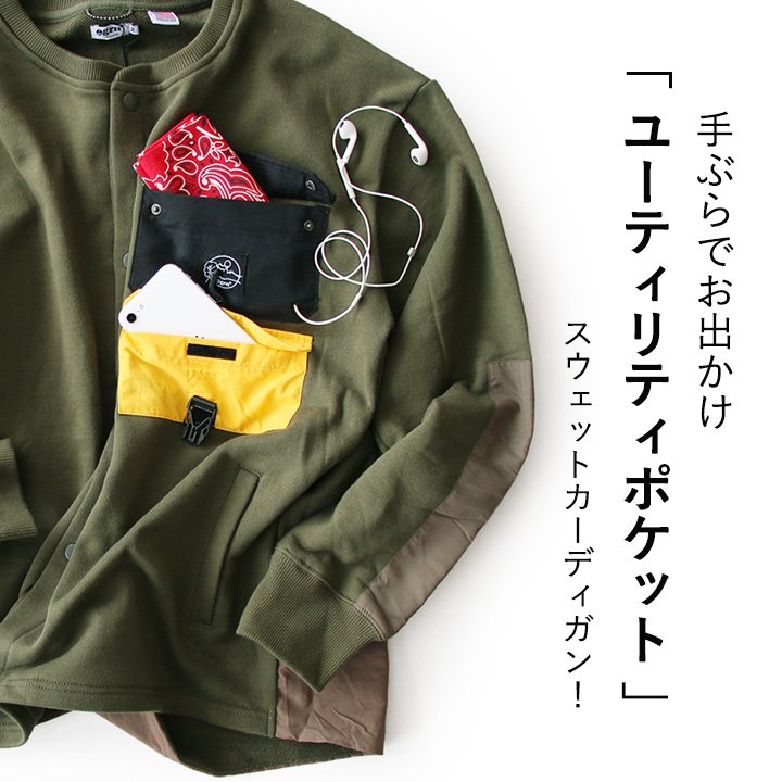 カーディガン 長袖 スウェット 無地 メンズ レディース ボタンアップ クルーネック ワイド 「手ぶらでお出かけできる 多収納 カラフル ナイロン ポケット」 裏毛 米綿 綿100% ワーク アウトドア カジュアル PATY パティ GRN×TOneontoNE ジーアールエヌ