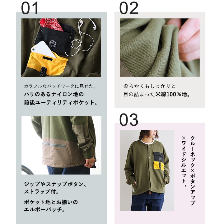 × × × ギフト対応 TOP コーディネート カラー 詳細 サイズ カートへ ↑上へ カーディガン 長袖 スウェット 無地 メンズ レディース ボタンアップ クルーネック ワイド 「手ぶらでお出かけできる 多収納 カラフル ナイロン ポケット」 裏毛 米綿 綿100% ワーク アウトドア カジュアル PATY パティ GRN×TOneontoNE ジーアールエヌ r210506010 [商品説明] ・カラフルなパッチワークに見せた、ハリのあるナイロン地の前後ユーティリティポケット。