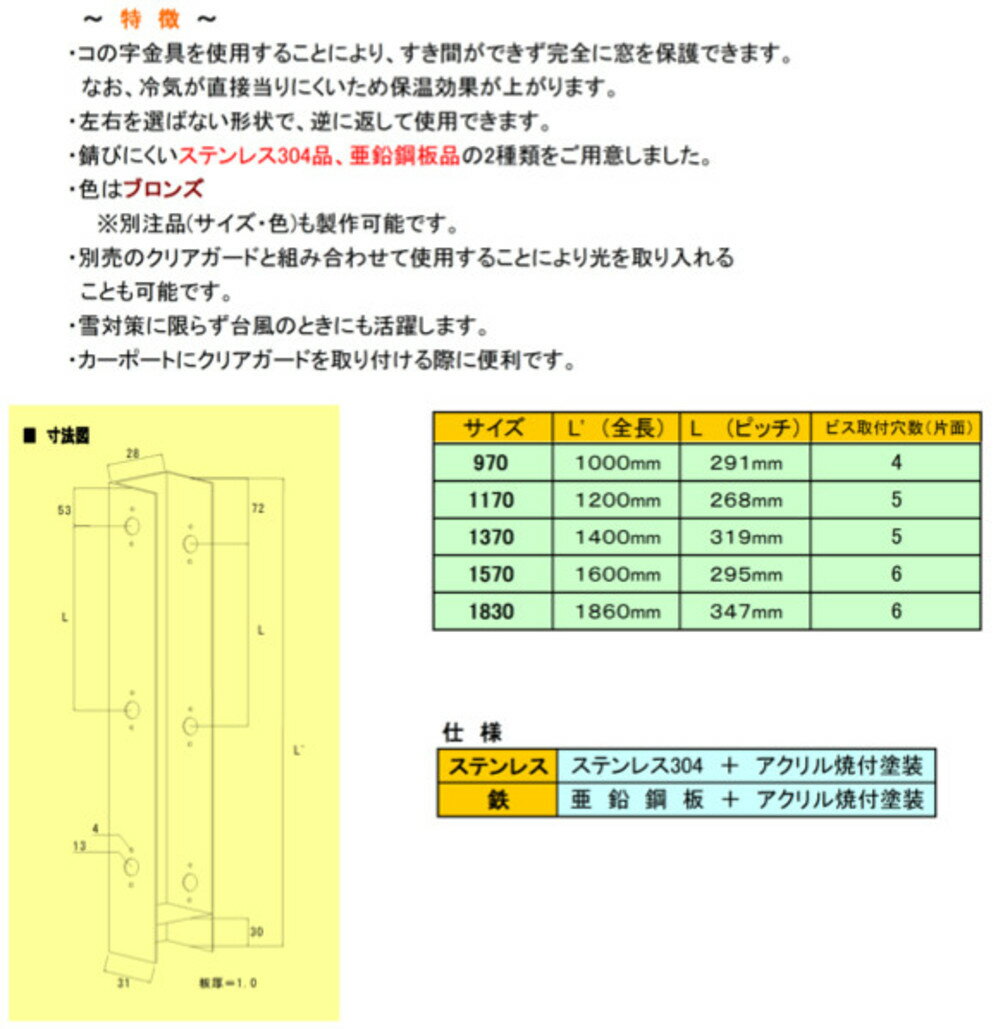 タナカ コの字金具ステンレス1830 ブロンズ 1860 AD5K05 10本の仕様サイズ1860カラーブロンズ材質ステンレス原産国日本 風雨避け 雪囲い カーポート;AD5K05