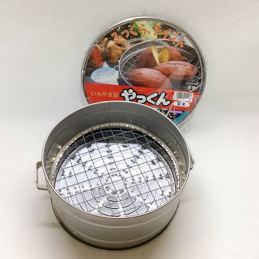 断熱構造ではないので火傷にご注意ください 商品情報 品名:いもやきき やっくんDX 製品サイズ(約):直径:245×高さ:14mm 材質:アルスター(鉄にアルミメッキ) 板厚:本体:0.3mm 底:0.5mm 重量:約650g