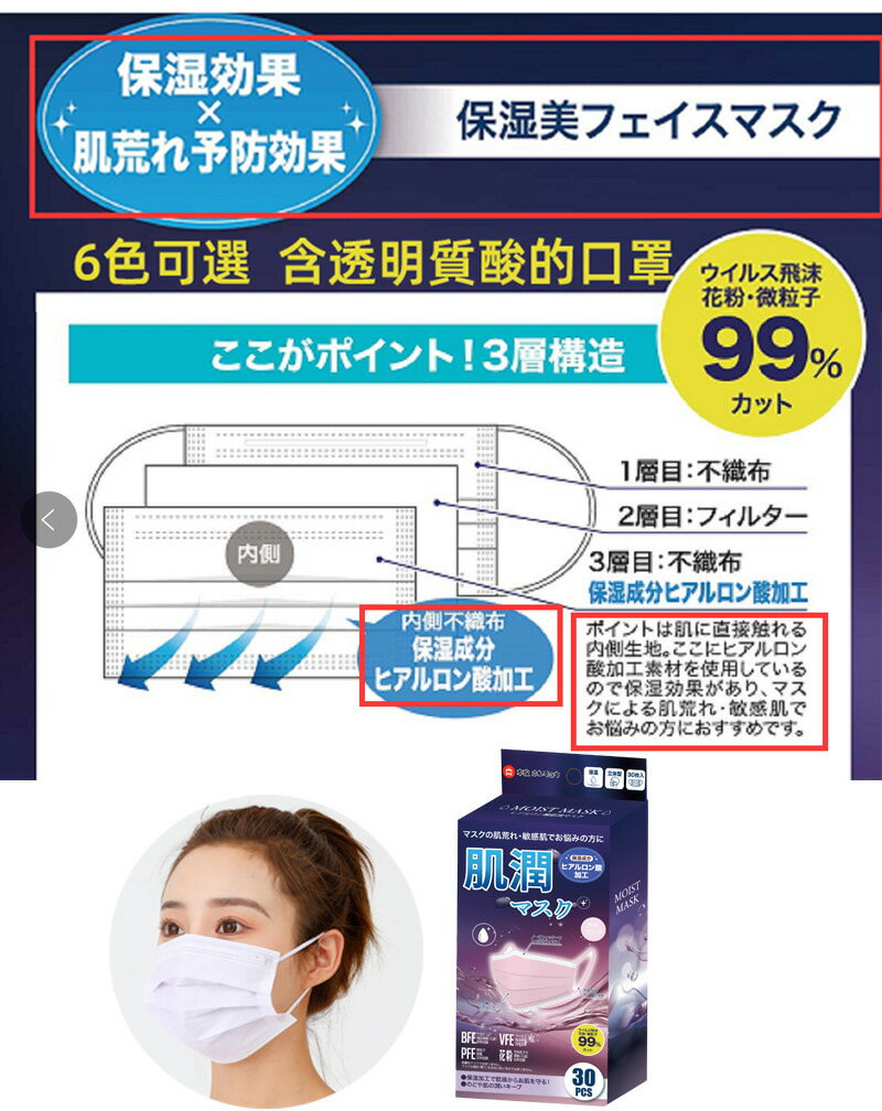 【商品名】■ヒアルロン酸マスク・不織布使い捨てマスク(6色選べる)【セット内容】 ■マスク本体60枚 【素材】 ■メルトブローン、ヒアルロン酸入り不織布、その他 【商品説明】 ■・マスク装着の際、使用中、外す際には、フィルター部分に触れないように注意してください。